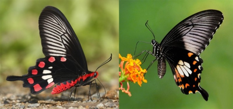 a borboleta mórmon comum (papilio polytes, à direita) imita os padrões de asa da borboleta rosa comum (à esquerda). Crédito: krushnamegh kunte (esq. ) and khew sin khoo (dir. )