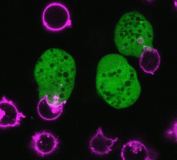 de mordida em mordida, a ameba enche o papo: entamoeba histolytica (verde) destrói e fagocita célula humana (em fluorescência roxa). Crédito: katherine ralston