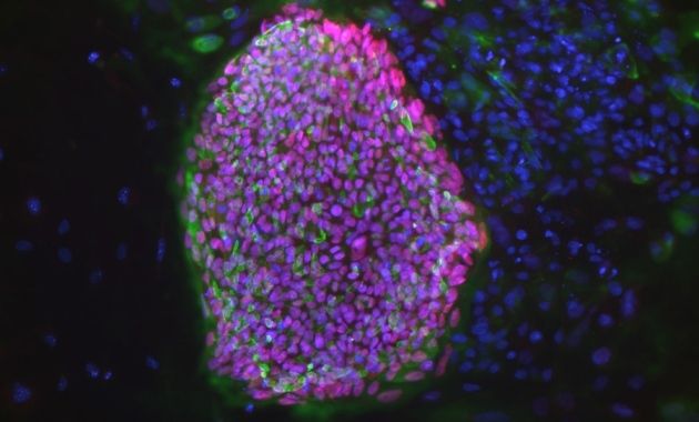 Colônia de células-tronco embrionárias obtidas através da clonagem de uma célula pertencente a uma mulher portadora de diabetes tipo 1. Pela primeira vez, cientistas demonstraram ser possível gerar células-tronco com embriões produzidos com o uso de células humanas adultas. Crédito: bjarki johannesson, nyscf