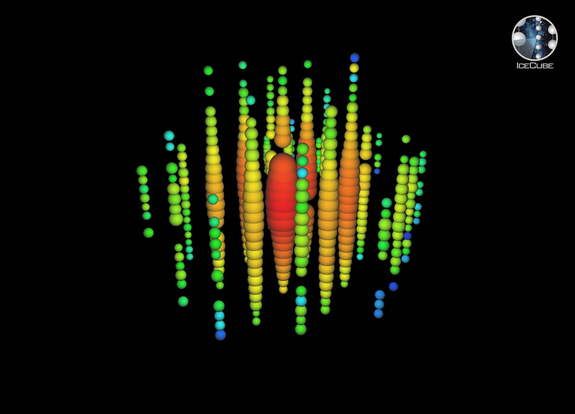 a imagem acima, de 3 de janeiro de 2012, mostra o “ernie”, o neutrino de mais alta energia (1,14 petaelétrons-volt) detectado até então pelo observatório icecube. Crédito: icecube neutrino observatory