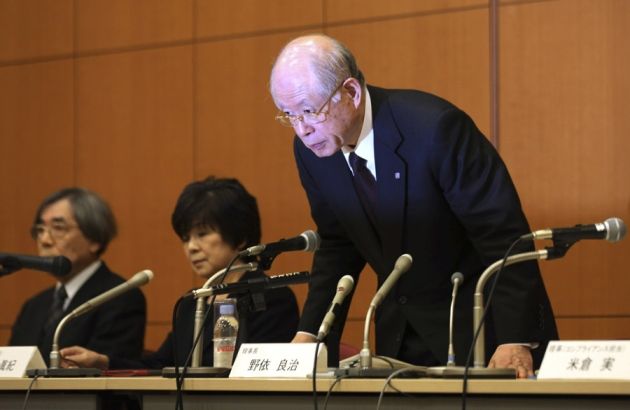 ryoji noyori, presidente do riken, faz reverência na coletiva de imprensa em que o instituto anunciou os resultados da investigação sobre a pesquisa de obokata. Foto: eugene hoshiko/ap/press association images