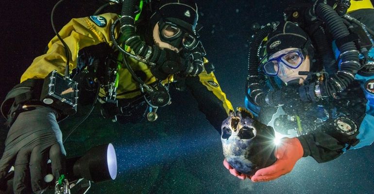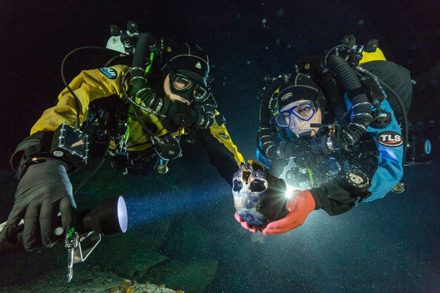 Crânio de Naia: Mergulhadores transportam um crânio de cerca de 12 mil anos de idade para a confecção de um modelo 3D. Crédito: Paul Nicklen/National Geographic