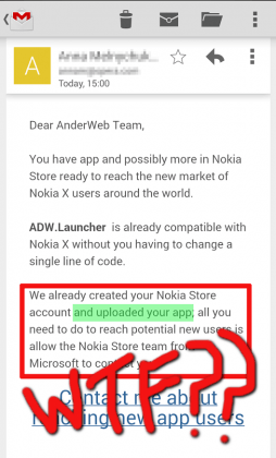 A Nokia tentou facilitar a vida a todos os developers, criando para cada um deles uma nova conta Nokia e realizando a publicação automática das suas aplicações na sua loja, ficando assim rapidamente disponíveis para os utilizadores do Nokia X e Nokia XL. O grande problema foi que os developers apenas foram informados destes acontecimentos já depois de os mesmos terem sido consumados, ou seja, as suas aplicações foram disponibilizadas numa loja de aplicações externa sem qualquer tipo de consentimento prévio.