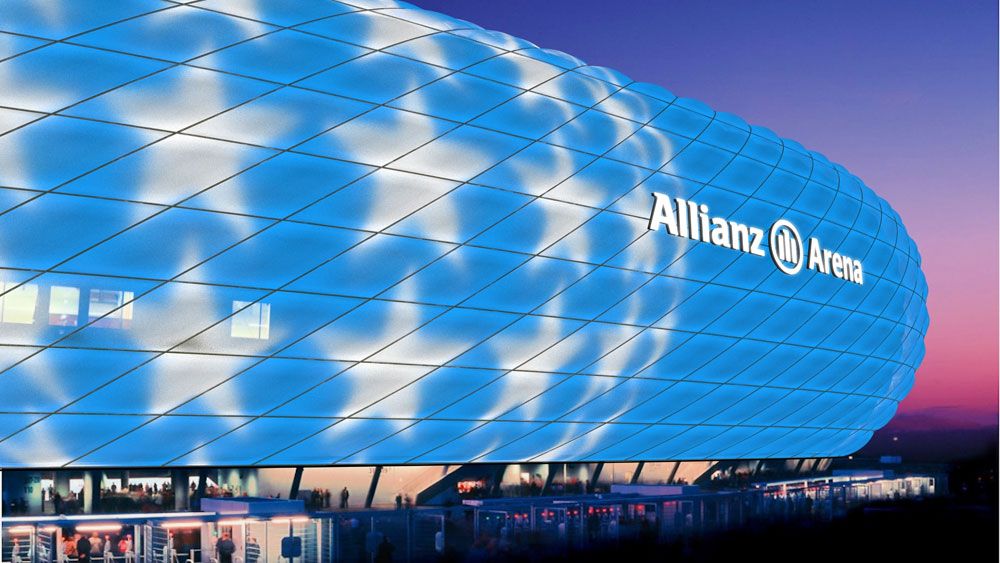 O estádio, com uma capacidade de 71.137, tem uma fachada em forma de concha que contem a maior membrana exterior do mundo. Encontra-se a 35 metros de altura e cobre aproximadamente 29.000 metros quadrados de superfície. Está será uma tela gigantesca para padrões de luz às cores e animações, oferecendo aos fãs e visitantes do estádio uma experiência única e inolvidável. No futuro, 380.000 LEDs dentro de 8.000 luminárias Philips ColorGraze, permitirão ao Allianz Arena mostrar mais do que simples imagens de iluminação estática. O novo sistema LED será 60% mais energeticamente eficiente que a iluminação convencional.