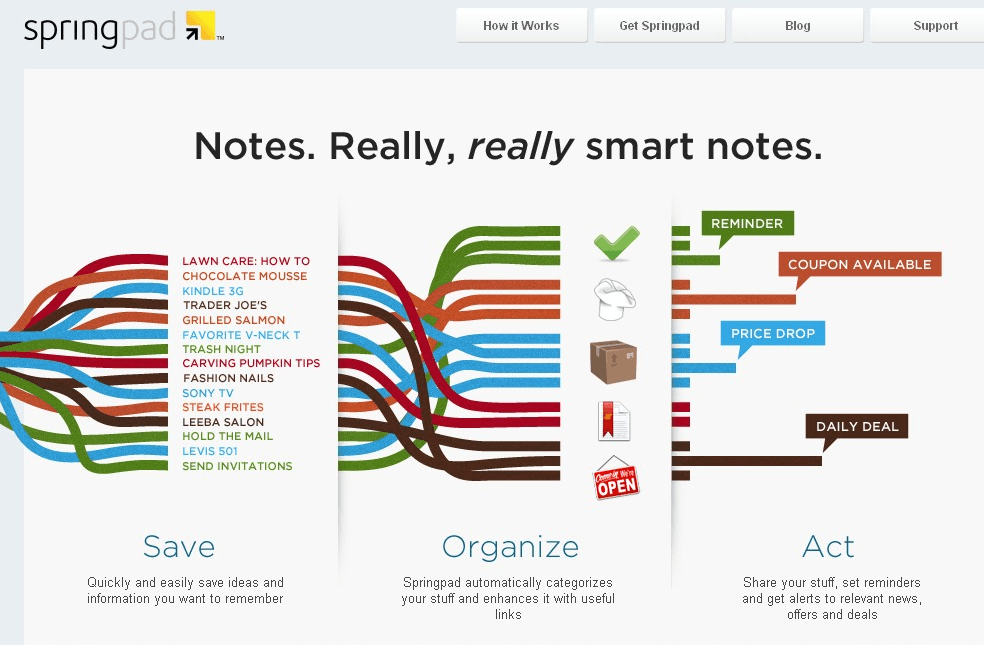 A Springpad surgiu no seu início de actividade como uma forte concorrente para o Evernote, pelo menos nessa altura inicial em que o Evernote ainda não se apresentava como um serviço tão rico em funcionalidades que conhecemos hoje em dia. No entanto, a Sprindpad nunca entrou numa competição directa de funcionalidades com o Evernote, apresentando-se mais como um caderno de notas pessoal em vez de um “caixote digital” onde se pode arquivar todo o tipo de conteúdos.