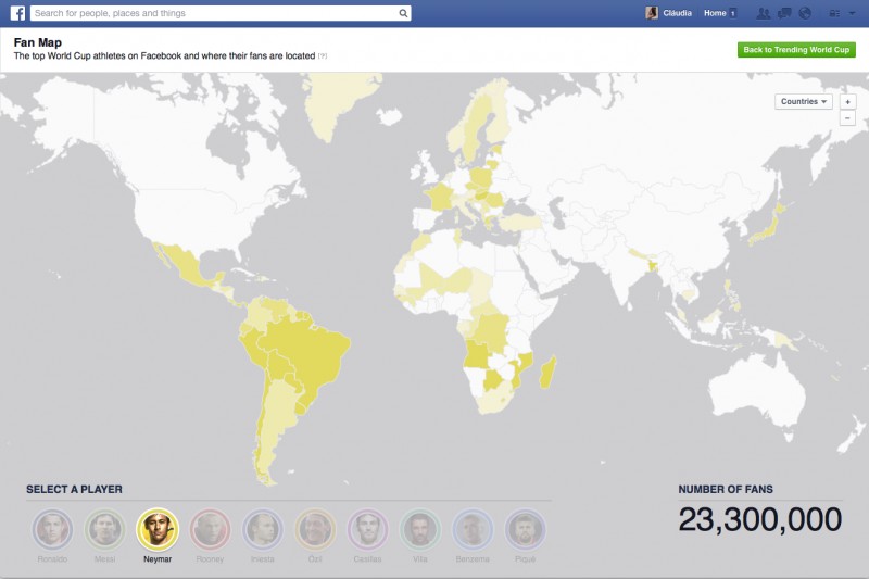 De acordo com comunicado, o Facebook informa, ainda, que será disponibilizando um mapa interativo, através do qual será possível verificar a popularidade dos principais jogadores por região. Para se ter uma ideia, no Brasil, o Neymar tem popularidade 13% acima da média, enquanto Messi está 1,5% abaixo.