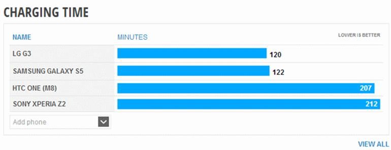 Outro comparativo realizado pelo site refere-se ao tempo em que os dispositivos demoram para realizar a sua recarga. Como resultado, o LG G3 mais uma vez superou os seus concorrentes e alcançou o menor tempo de recarga, 120 minutos. O segundo lugar ficou por conta do Galaxy S5 que atingiu 122 minutos de recarga e o terceiro com o HTC One M8 com 207 minutos.