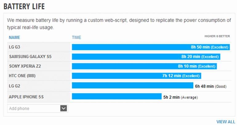 A informação foi divulgada pelo site Phone Arena que, ao utilizar um script personalizado que replica o consumo típico de energia no smartphone, verificou que a bateria do novo G3 alcançou maior tempo de duração em comparação a de outros dispositivos, como o Samsung Galaxy S5. Em uma escala, a bateria do aparelho da LG ficou em primeiro lugar ao atingir aproximadamente 8 horas e 50 minutos de duração, enquanto que o Samsung Galaxy S5 ficou em segundo lugar (com 8 horas e 30 minutos) e o Xperia Z2 em terceiro (8 horas e 10 minutos).
