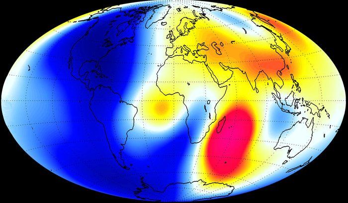 Os dados apurados pela missão Swarm, composta por três satélites, indicam que os maiores pontos fracos da proteção do campo magnético têm se expandido no Hemisfério Ocidental, ao passo que o campo foi intensificado em outras áreas como, por exemplo, o sul do Oceano Índico (veja a imagem acima). Os cientistas ainda não estão certos quando à razão de o campo magnético estar, em média, enfraquecendo-se, mas a principal suspeita é a inversão dos polos magnéticos — que pode estar prestes a ocorrer.