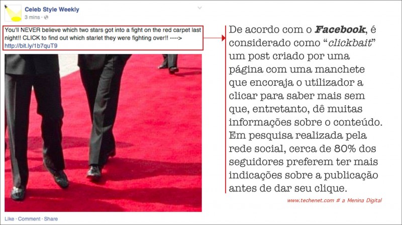 A medida pretende coibir o a proliferação de posts com chamadas como, por exemplo, “Você não vai acreditar no quê este bebê fez!”, cada vez mais comuns nos feeds de notícias e que acabam por “fisgar” a atenção dos utilizadores apenas por despertar a natural curiosidade do leitor, gerando muitos acessos e compartilhamentos.