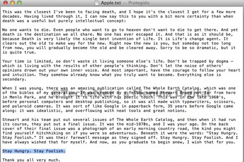 O famoso discurso de Steve Jobs aos formandos da Stanford University, na Califórnia, em 2005, é lembrado até hoje como um dos discursos mais marcantes da história. Visto e revisto por milhares de pessoas (“apple addict” ou não), as palavras inspiradoras de Jobs são até hoje uma referência. O que talvez você ainda não saiba é que o texto completo está “escondido” no seu Mac e à distancia de uns poucos comandos e clique.