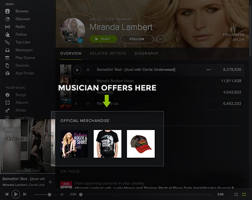 Spotify e BandPage anunciam parceria que pretende viabilizar uma loja online 40 milhões de utilizadores da plataforma de streaming mais famosa do mundo. Esta união permitirá aos cerca de 500 mil artistas do site BandPage venderem passes de acesso especiais, t-shirts e outras ofertas exclusivas para os fãs, tudo a partir do player principal do Spotify.