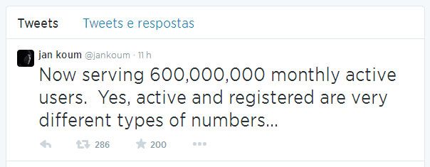 A revelação foi feita por Jam Koum, CEO e fundador do WhatsApp, através do Twitter: “Agora servindo 600 milhões de usuários ativos por mês. Sim, ativo e registado são muito diferentes tipos de números …” ( “Now serving 600,000,000 monthly active users. Yes, active and registered are very different types of numbers…”)
