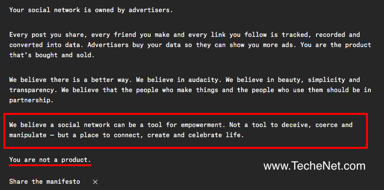De acordo com informações adiantadas pelo Business Insider, a receita que garantirá (ou não!) a sobrevivência da plataforma viria de recursos oferecidos em troca de uma pequena quantia paga pelos próprios utilizadores. O que significa, na prática, que será sempre gratuito utilizar as funções básicas do serviço, mas que algumas das ferramentas utilizadas serão pagas. Para manter de pé esse compromisso, os criadores da rede social até criaram um manifesto, comprometendo-se em nunca exibir anúncios ou vender informação.