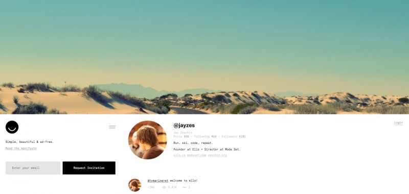 Criada pelo designer Paulo Budnitz, a nova rede social Ello tem causado certo buzz nas demais plataformas de partilha. Além de oferecer aos utilizadores um ambiente com visual limpo e sofisticado, a plataforma nasce com a promessa de ser uma comunidade virtual sem a presença de anúncios.