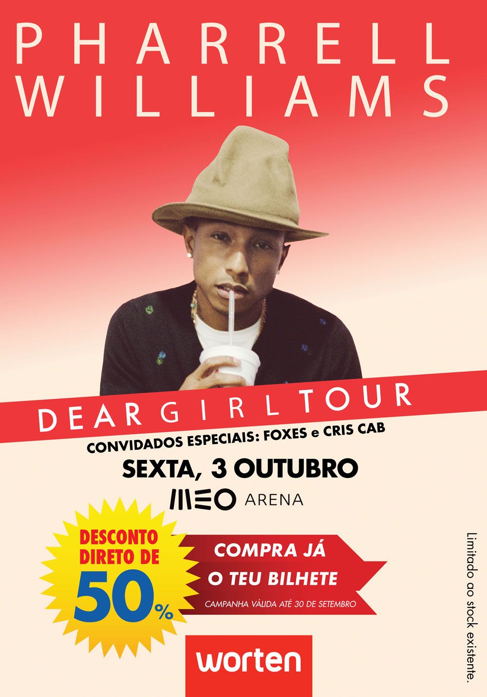 A Worten oferece, em exclusivo, 50% de desconto direto nos bilhetes para o concerto de Pharrell Williams, que atua a 3 de outubro no MEO Arena, em Lisboa. A promoção está em vigor desde o dia 12 de setembro e até ao dia 30 de setembro.