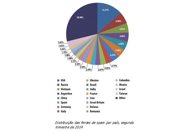 Os Estados Unidos ocupam primeiro lugar entre os países fonte de spam, com 13,4% de email não solicitado enviado para todo o mundo. Os restantes países fontes de spam distribuem-se de uma maneira bastante uniforme. De uma maneira geral, isto tem uma explicação: as botnets estão distribuídas pelo mundo e existem equipamentos infectados em todos os países. No segundo lugar, está a Rússia, a partir de onde se enviam 6% do spam mundial. No terceiro lugar está o Vietname (5%).