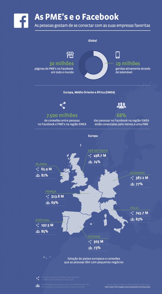 Em Portugal, 85% dos utilizadores do Facebook têm pelo menos uma conexão a uma página de pequena empresa ou negócio, somando um total de 197,3 milhões de conexões, dados que apontam que quem utiliza a rede social gosta de estar em contato com negócios que lhes são mais relevantes.