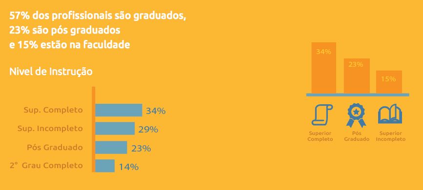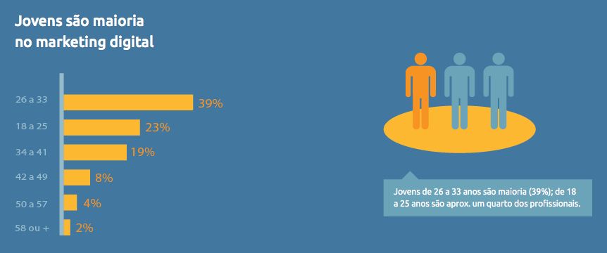 Segundo os dados publicados na pesquisa, jovens entre 26 e 33 anos compõem a maioria no mercado, com 39%. A área é nova e há muito que ser explorada pelos profissionais, visto que 48% dos entrevistados dizem trabalhar há menos de 12 meses.