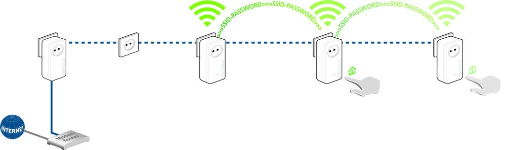Dispositivos terminais móveis como smartphones, tablets e portáteis ligam-se automaticamente do router Wi-Fi ao adaptador dLAN se o adaptador oferecer um sinal Wi-Fi mais forte. Isto garante a melhor receção Wi-Fi nas divisões onde a navegação sem fios não era antes possível. Múltiplas ligações dLAN 1200+ Wi-Fi ac podem também ser combinadas – isto permite a melhor receção Wi-Fi da cave ao sótão.