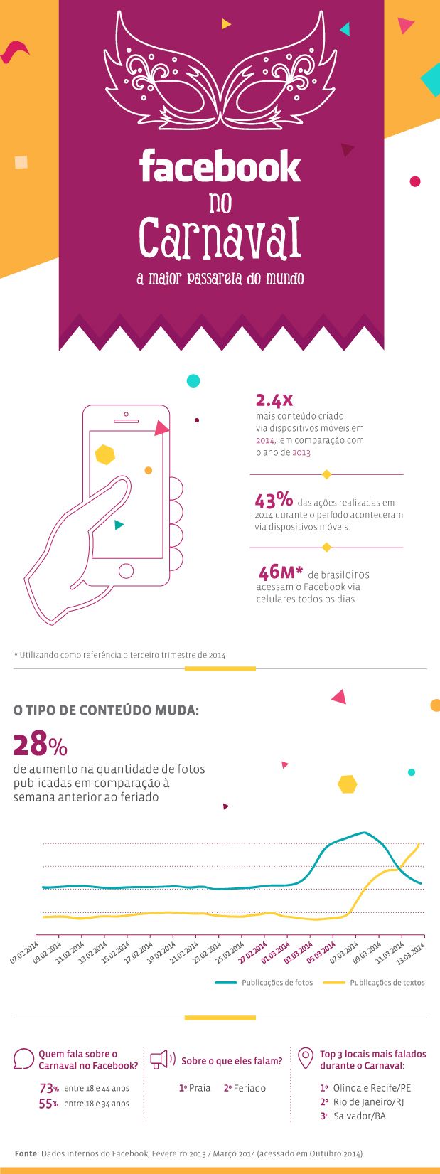 Só para se ter uma vaga ideia, ao comparar a utilização da rede no Carnaval de 2014 e o de 2013, por exemplo, verifica-se um crescimento de 2,4 vezes na produção de conteúdo nesses dispositivos. A fim de dar às marcas e profissionais de social media uma orientação acertada do que fazer durante esse período, a própria equipa de Mark Zuckerberg desenvolveu um infográfico com os principais dados sobre o comportamento dos utilizadores durante o Carnaval. CONFIRA!