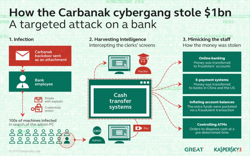 Os cibercriminosos começavam por acedera o computador de um funcionário através de “spear phishing”, uma burla realizada por correio electrónico cujo único propósito é obter acesso não autorizado a dados confidenciais, infectando a vítima com o malware Carbanak. Conseguiram violar a rede interna e localizar os computadores dos administradores para os vigiar através de vídeo. Isto permitiu-lhes ver e gravar tudo o que se passava nos ecrãs dos computadores do pessoal que lidava com os sistemas de transferência de dinheiro vivo.