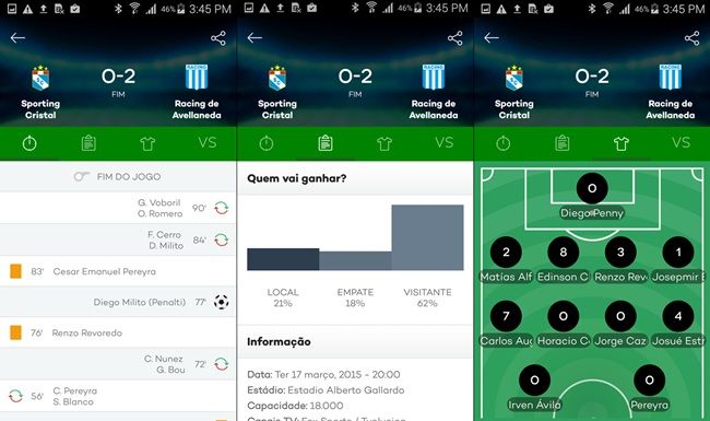 Ao acompanha as partidas diretamente no aplicativo você tem acesso aos lances do jogo, escalação e ainda pode dar um palpite sobre quem irá vencer a partida ou se terminará empatado. O visual do aplicativo em geral também agrada, com linhas sóbrias e cores verdes que remetem ao gramado dos estádios.