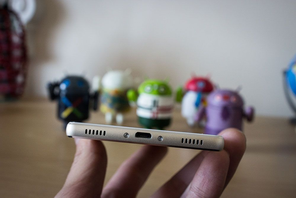 Na base do P8 está colocada a entrada microUSB e as grelhas com duas colunas, enquanto que o topo do terminal apenas tem presente a entrada para headphones.