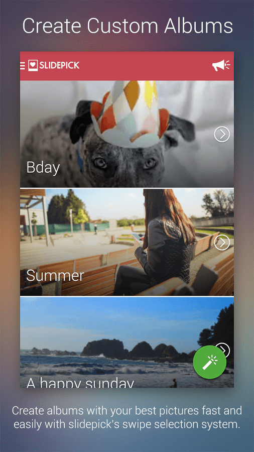 Irá também ser capaz de criar álbuns  personalizáveis dentro da própria aplicação, escolhendo quais as fotos que pretende inserir através de um simples deslizar do seu dedo.  Qualquer foto que capture com o seu smartphone irá ser organizada também em álbuns, oferecendo depois a possibilidade de as mover, alterar o nome ou apagar. Os albúns criados têm também uma funcionalidade muito prática, podendo partilhar um álbum completo no seu Facebook sem necessitar de fazer o upload de cada fotografia individualmente.
