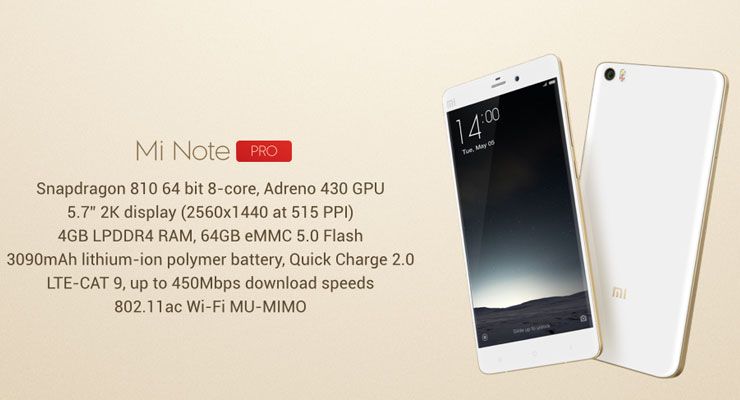 O Xiaomi Mi Note Pro irá ser comercializado na China por aproximadamente 430 euros e por este preço irá oferecer algum do melhor hardware disponível actualmente. O Mi Note Pro tem um ecrã QHD de 5.7 polegadas com 515 PPI (pixel per inch), processador octa-core 64-bit Qualcomm Snapdragon 810 SoC (2.5GHz), processador gráfico Adreno 430, 4GB de memória RAM e 64GB de memória interna.