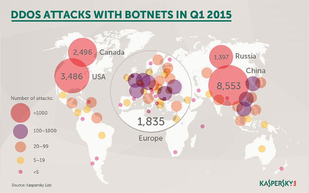 Os cibercriminosos perpetraram mais de 23.000 ataques DDoS (ataques de de negação de serviço) através de botnets aos recursos web em 76 países durante o primeiro trimestre de 2015, segundo a Kaspersky Lab. Os servidores nos EUA, Canadá e China foram os que mais ataques sofreram, mas entre as 10 principais zonas atacadas também se inclui a Europa e a região da Ásia-Pacífico, de acordo com as últimas estatísticas da empresa.