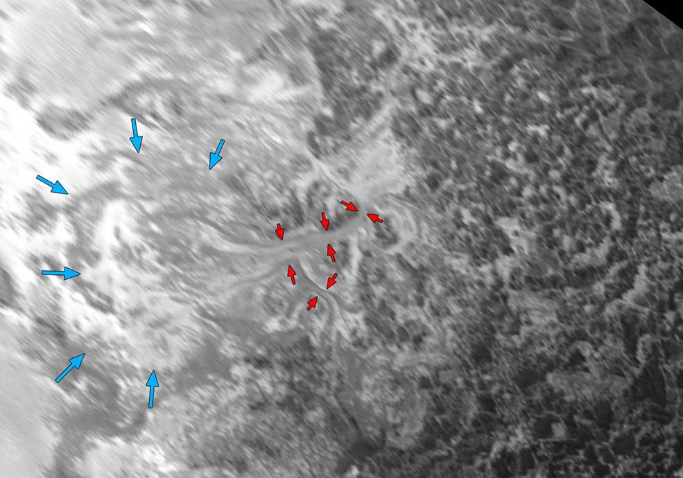Vale glaciar em Plutão: Gelo (nitrogénio, provavelmente congelado) que parece ter-se acumulado nas terras altas no lado direito da imagem e ter sido drenado das montanhas de Plutão para o Sputnik Planum é indicado pelas setas vermelhas. A frente do fluxo do gelo movendo-se para Sputnik Planum é delineada pelas setas azuis. A origem das cristas e cavidades no lado direito da imagem permanece incerto. Foto:NASA/JHUAPL/SwRI