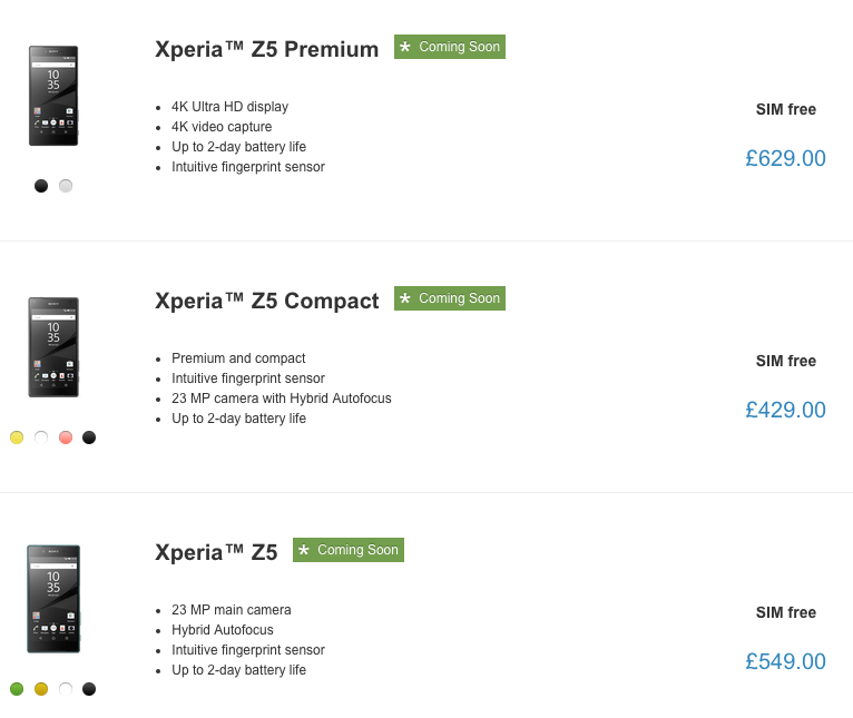 Pode-se ver agora na loja online da Sony que nenhum dos terminais se encontra com o mesmo valor apresentado inicialmente, tendo sido o Z5 Compact a sofrer a maior redução para £429 (uma redução de £120!), enquanto que o primeiro smartphone do mundo com ecrã 4K – Z5 Premium – viu o seu preço reduzido para £629 e a versão original do Xperia Z5 baixou para as £549.