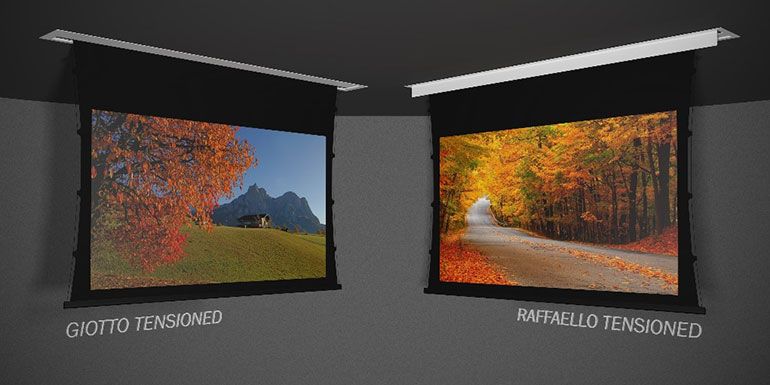 Pensados especificamente para instalações de encastrar em tetos falsos, os ecrãs Giotto e Raffaello estão equipados com um sistema tensionado peculiar que potencia a perfeita planura da superfície de projeção. De salientar ainda que as suas laterais pretas têm a forma de ampulheta devido ao fio de tensão que faz com que esta seja corretamente distribuída em cada tela.