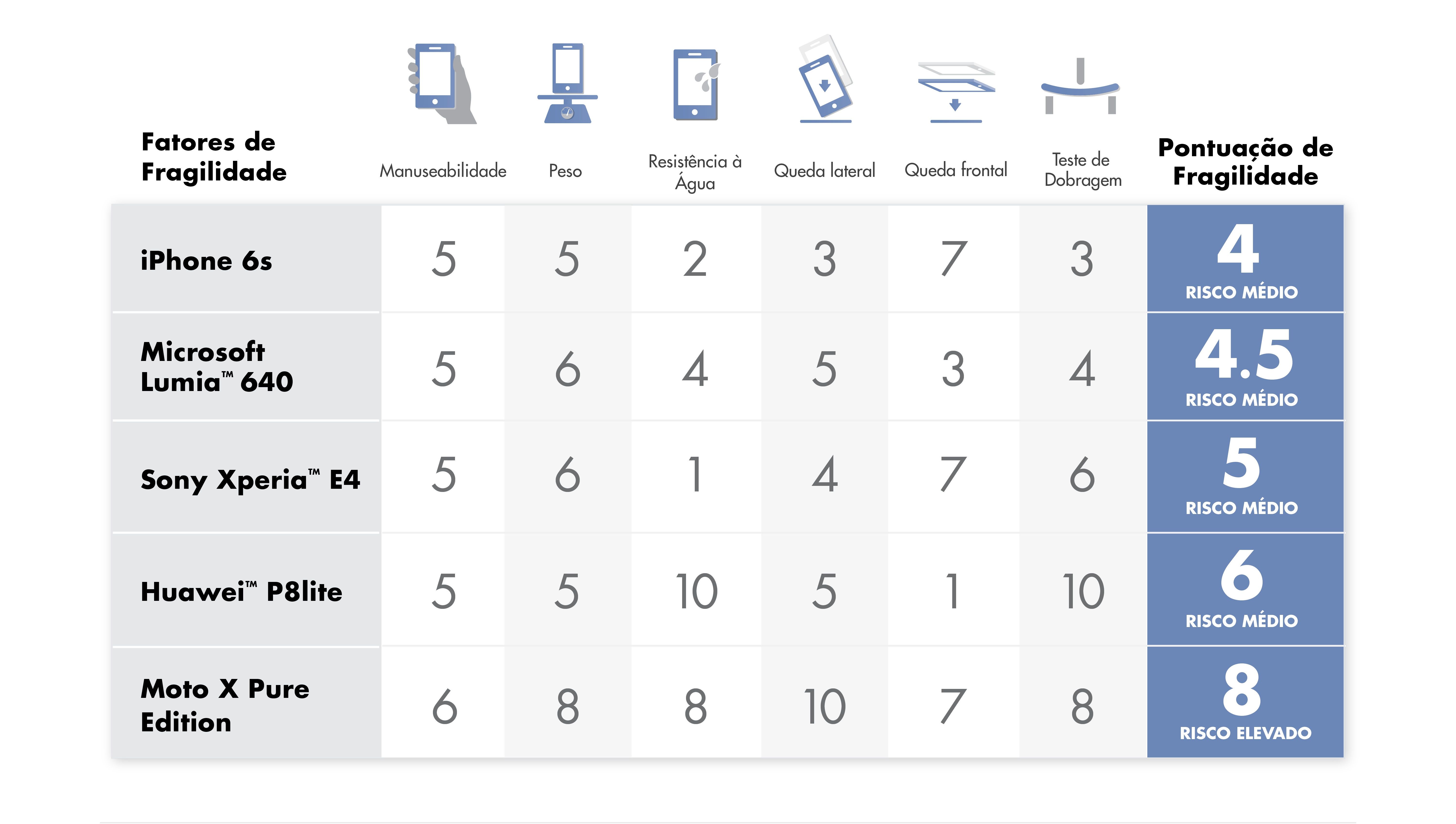 Os resultados revelam que o modelo Moto X Pure Edition, o maior e mais dispendioso desta categoria, é o que apresenta menor durabilidade e o telefone mais quebrável que a SquareTrade testou nos últimos anos. O modelo Lumia 640, um dos mais baratos já testados, é o que apresenta o maior grau de durabilidade, quase tanto quanto o iPhone 6S, custando metade do preço aos consumidores.