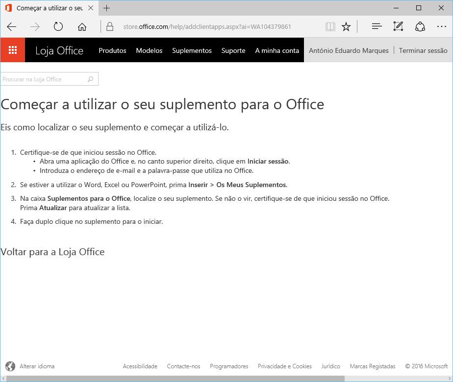 Para instalação deste suplemento, basta pesquisar por “Priberam” na Loja Office (http://store.office.com) e seguir as instruções. A instalação requer que o utilizador inicie sessão a partir do Word ou do Excel com uma conta Microsoft (via Outlook.com, por exemplo) e a utilização do Dicionário Priberam requer igualmente uma ligação à Internet ativa para poder funcionar.