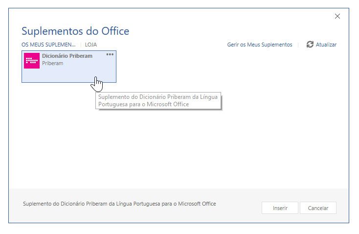 O suplemento é aberto através do botão “Os Meus Suplementos” do menu “Inserir” do Word ou do Excel; depois, é só selecionar uma palavra no texto ou pesquisar diretamente na aplicação.