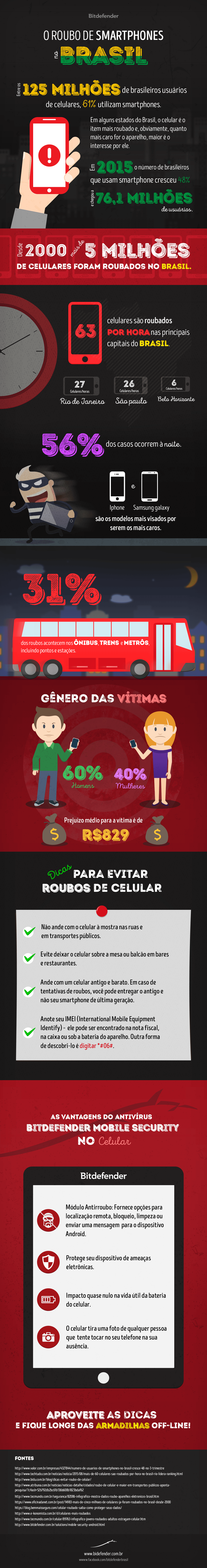 Com o intuito de ajudar os utilizadores, a Bitdefender Antivírus elaborou um infográfico com dados sobre o roubo dos smartphones no Brasil. O conteúdo reforça as dicas de como evitar ter o aparelho levado por ladrões e as vantagens de ter o Antivírus no celular, que conta com um módulo antirroubo.