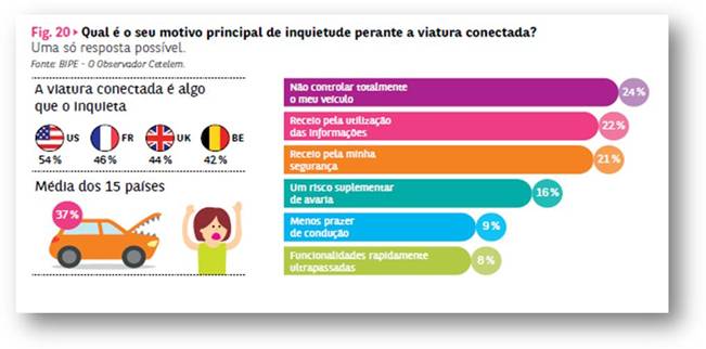 Tal como em Portugal, também no resto do mundo a viatura conectada suscita ainda alguns receios: 37% dos automobilistas mundiais admitem sentirem-se inquietos perante os progressos do automóvel. Essa percentagem chega mesmo aos 54% nos Estados Unidos e aos 46% em França. Entre os principais motivos de preocupação está, mais uma vez, o medo de não controlar totalmente o veículo (24%) e a desconfiança sobre a utilização que poderá ser feita dos dados transmitidos (22%).