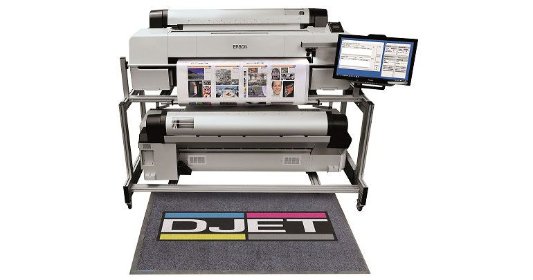 O sistema DJet 10000 liga pares de impressoras Epson SC-P10000 em sequência, pelo que cada impressora imprime um lado do rolo não cortado. Criado com o mínimo de partes mecânicas para maior fiabilidade e facilidade de operação, o sistema DJet inclui um circuito tampão de papel entre as duas impressoras. Software de controlo personalizado acrescenta códigos de identificação e posicionamento a cada trabalho. Estes são lidos por câmaras de vídeo e processados pelo software de controlo para confirmar o alinhamento do rolo impresso. O sistema regista continuamente a posição do papel impresso, garantindo alta precisão do registo frente e verso. Os trabalhos impressos podem então ser cortados e dobrados conforme necessário para apresentar uma brochura ou livro virtualmente acabado com a paginação correta ou usar como impressão concluída de materiais para exposição de duas faces e aplicações semelhantes. O software de controlo do DJet também suporta bitmap, além de formatos de ficheiros Epson de uma grande variedade de fluxos de trabalho de pré-impressão. As páginas-teste e produção de brochuras foram demonstradas na Drupa.