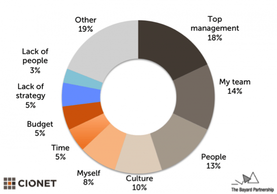 A CIONET levou a cabo um estudo no seu evento anual “Digital Leadership Summit CIO CITY’16”, o qual reuniu opiniões dos 150 CIOs presentes. O objetivo era levar os presentes a refletir sobre quais os pontos de maior resistência/dificuldade nas suas organizações.