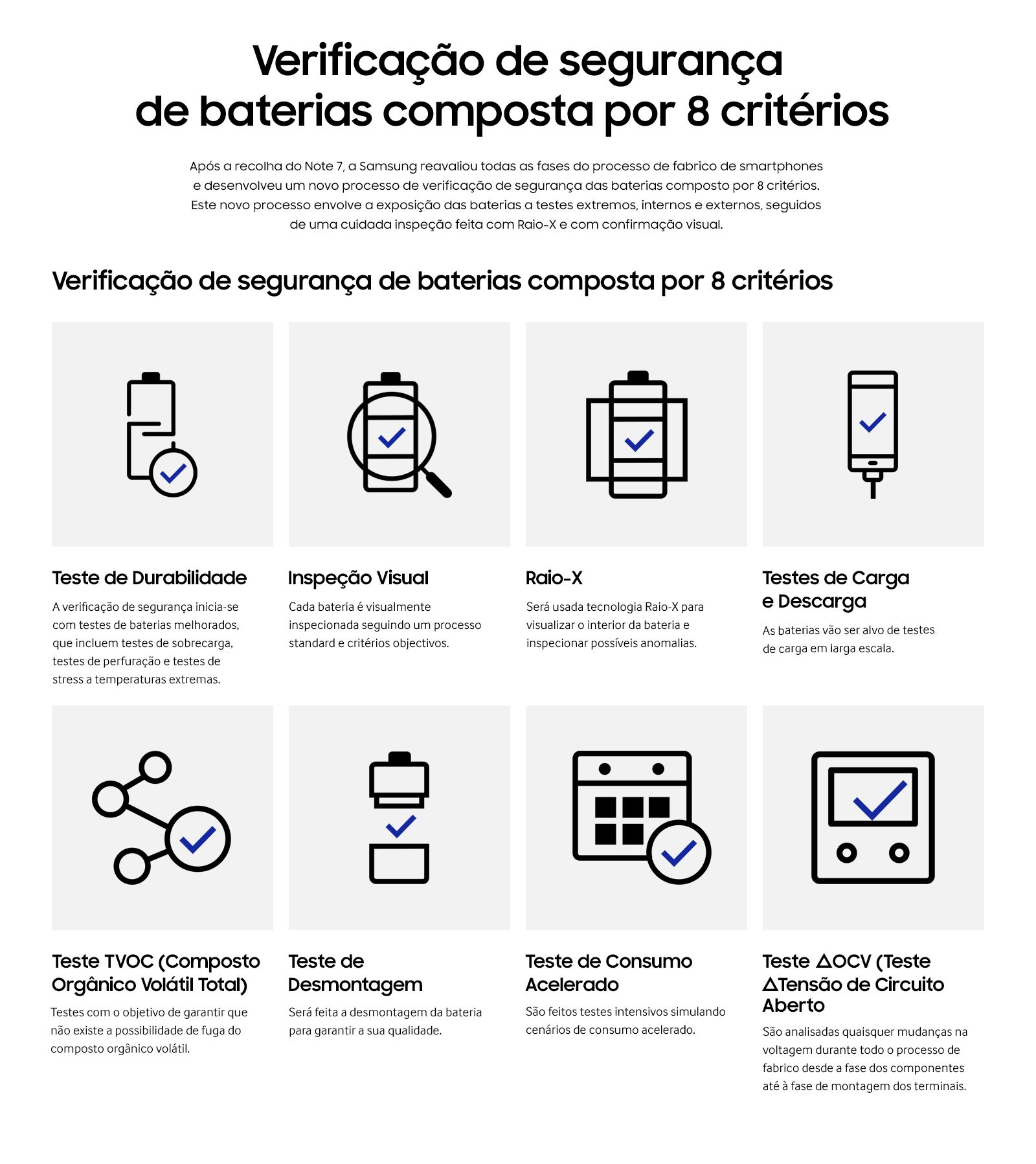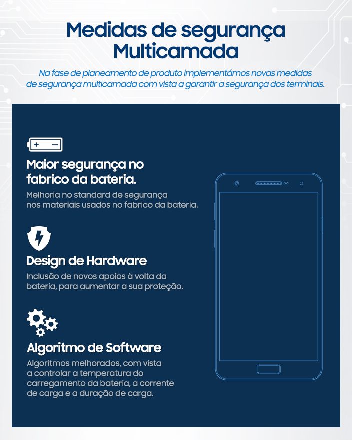 Com base nas conclusões da investigação, a Samsung implementou uma série de processos de controlo de qualidade e segurança, com vista a assegurar a segurança dos produtos, incluindo protocolos adicionais, tais como medidas de segurança multicamadas e um processo de verificação de segurança da Bateria, composto por 8 critérios.