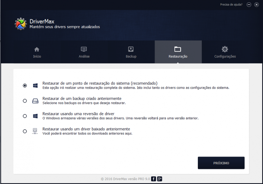 Mais que somente uma restauração dos drivers, trata-se de uma restauração de todos os ajustes do sistema. Com somente dois cliques, DriverMax realiza uma restauração completa na qual o dispositivo volta a ter as configurações que tinha no momento que salvou a última cópia de segurança do sistema.