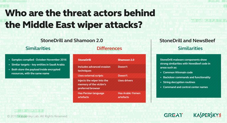 A equipa de análise e investigação da Kaspersky Lab (GREAT) conseguiu identificar um novo malware wiper de nome StoneDrill. Semelhante a Shamoon, um wiper anterior, destrói todas as informações que se encontram no equipamento infetado. StoneDrill dispõe de avançadas técnicas anti deteção e espionagem. Para além dos seus objetivos no Médio Oriente, StoneDrill já foi identificado também na Europa, onde os wipers ainda não tinham surgido.