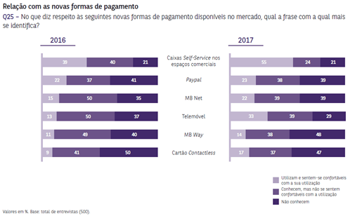 Entre as novas formas de pagamento mais utilizadas pelos portugueses surgem também o Paypal (23%), o MB Net (22%) e o Cartão Contactless (17%). O MB Way (14%) é a nova forma de pagamento menos utilizada e sobre a qual existe maior desconhecimento entre os consumidores (48% nunca ouviram falar). Ainda assim, à semelhança dos outros serviços, regista um aumento de utilização em relação a 2016.