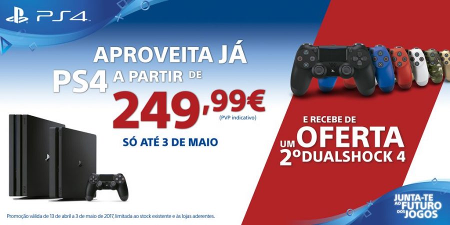 Durante esta nova promoção, que é válida 13 de abril a 3 de maio, a PlayStation 4 500GB pode ser adquirida por a 249,99 €*, a versão de 1TB por 264,99 €* e a PlayStation 4 Pro estará disponível nas lojas por 399,99 €. A PlayStation também revelou que todas estas oportunidades incluem a oferta de um comando DUALSHOCK 4.
