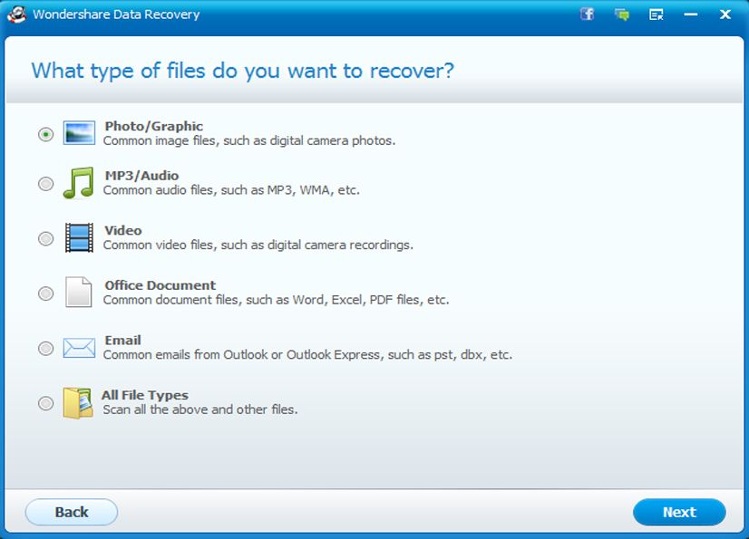 Para além do menu standard onde são apresentadas as 4 opções mencionadas anteriormente, o Wondershare Recovery Wizard tem ainda a opção do modo Wizard que te oferece uma experiência ainda mais simples e rápida de iniciar a pesquisa pelos teus ficheiros perdidos.