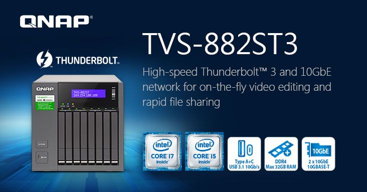 A QNAP anunciou hoje o lançamento de uma nova solução de armazenamento de alta velocidade. O novo NAS Thunderbolt 3 TVS-882ST3, com 8 baías de 2,5 polegadas, está equipado com processadores quad-core Intel 14nm Core i7/i5 (varia em função da versão), inclui encriptação AES-NI e é energeticamente eficiente.