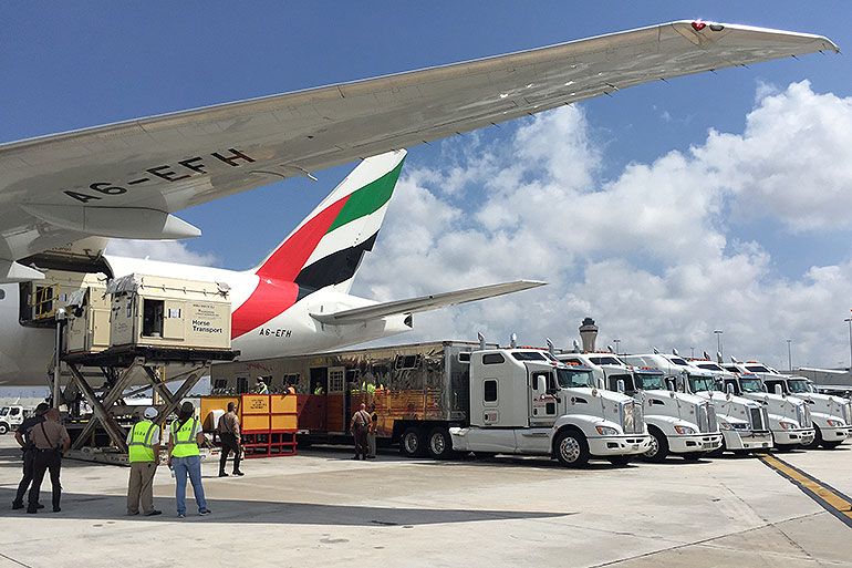 A Emirates SkyCargo, a divisão de carga da Emirates, transportou alguns dos melhores cavalos de salto do mundo, por três continentes, no espaço de um mês. Os cavalos foram transportados de Liège, na Bélgica, para competir nos três primeiros circuitos do Longines Global Champions Tour, em abril de 2017, na Cidade do México, em Miami e Xangai.