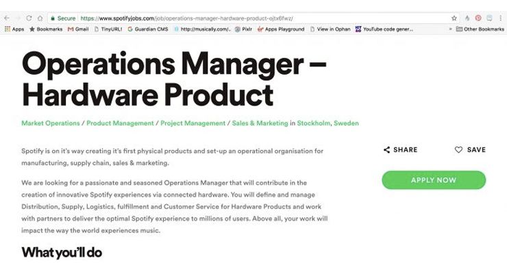 No site do próprio Spotify foram publicadas várias novas posições de trabalho disponíveis que sugerem que a maior empresa de streaming de música estará a preparar-se para desenvolver o seu primeiro produto físico. Numa das novas posições disponíveis – Operation Manager – pode-se ler na descrição que o “Spotify está a caminho de desenvolver os seus primeiros produtos físicos, e estabelecer uma organização operacional para produção, distribuição, vendas e marketing” é definitivamente importante para o sucesso destes novos produtos.